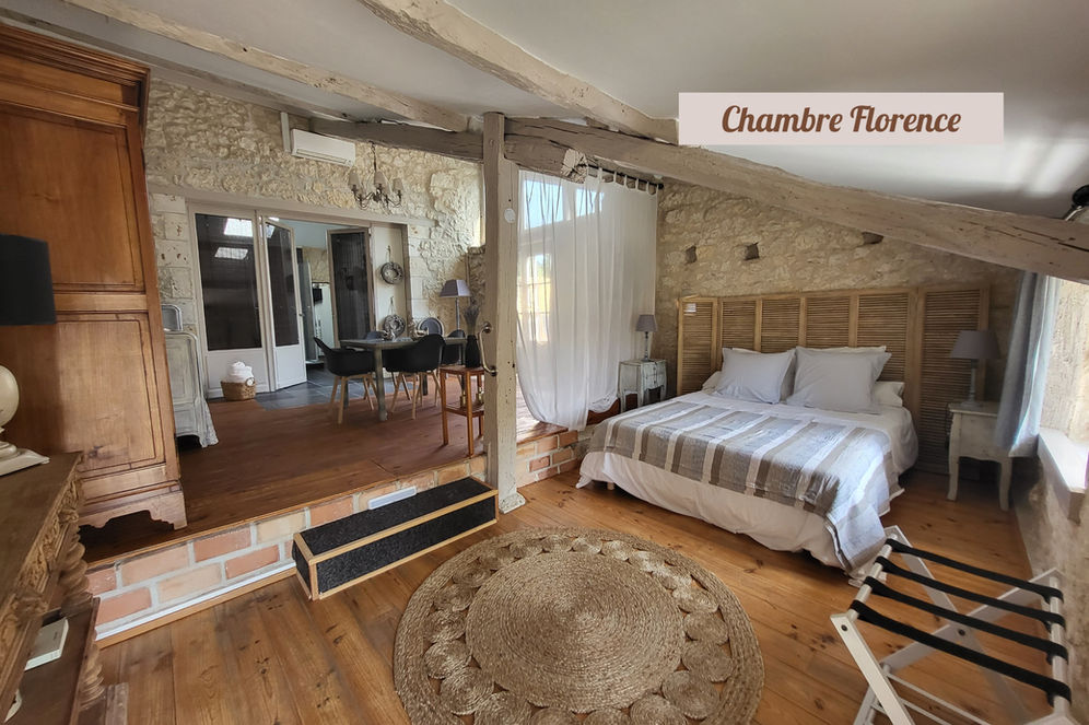La première partie "Florence" se compose d'une grande chambre tout confort pour 2 ainsi qu'un lit d'appoint pour une personne, d'un petit salon, d'une vaste salle de bain, d'une double vasque et wc et d'une terrasse privée aménagée avec transats et parasol.